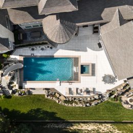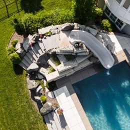 This family home was designed with something for everyone. A large pool deck creates ample outdoor living space using porcelain pavers; the perfect place for meals together, sun bathing, and gathering around the fire pit. A water slide gives natural appeal as it is built-in using forged limestone boulders with pockets for plantings. Low maintenance plantings throughout the yard allow for time to be spent with family utilizing this exciting backyard design. Landscape lighting completes the design, making this the perfect hangout day or night.